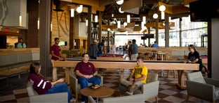 The First Floor includes a comfortable atmosphere with televisions, billiards, an air hockey table and a stage for live entertainment. Students can find Made-To-Order grilled favorites at Avalanche, fresh out-of-the-oven pizza at Hearth, specialty espresso beverages and pastries at Kafe, a continental breakfast nook in Sunnyside's, and Made-To-Order sandwiches at Hearth Deli.